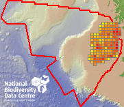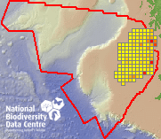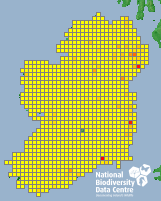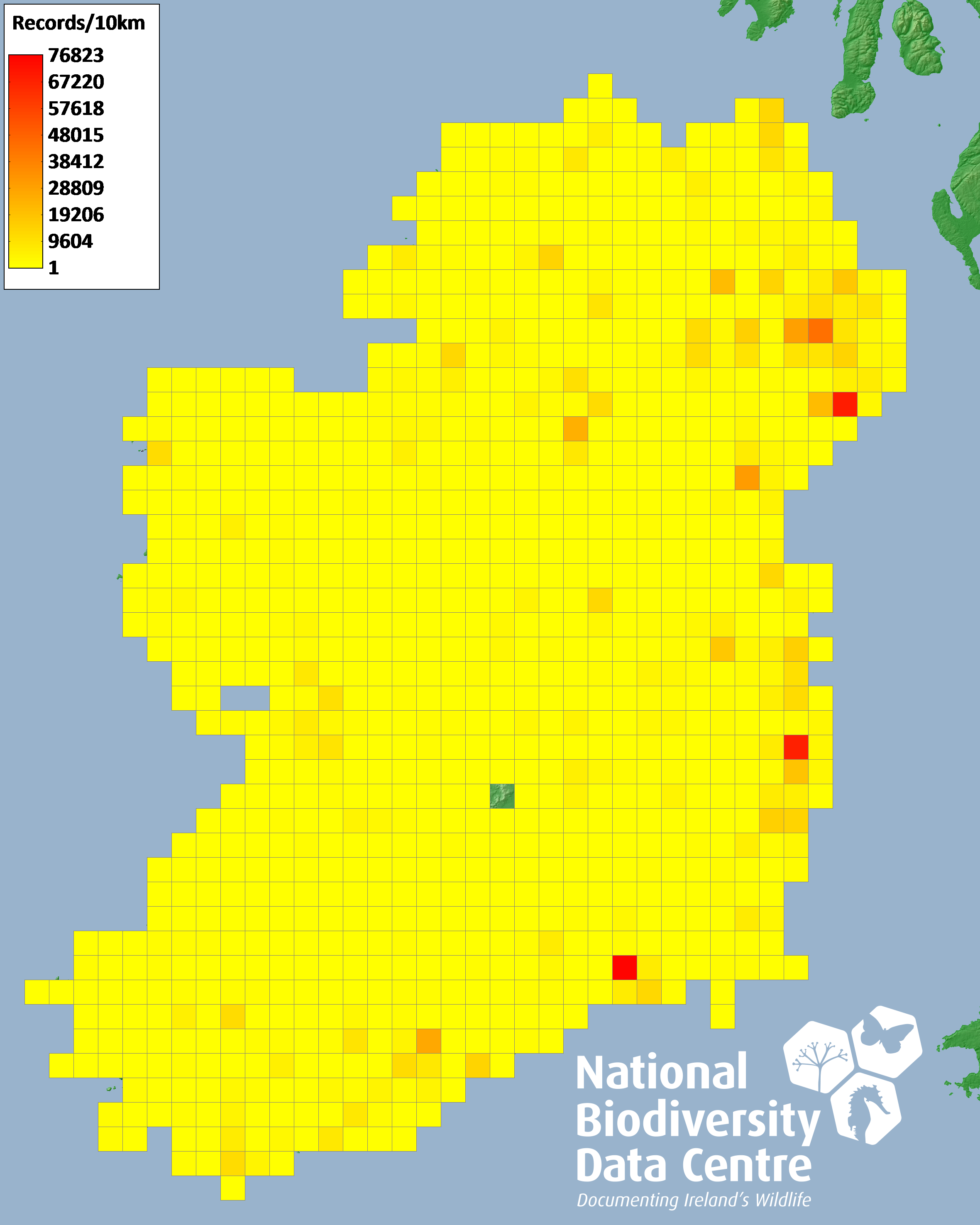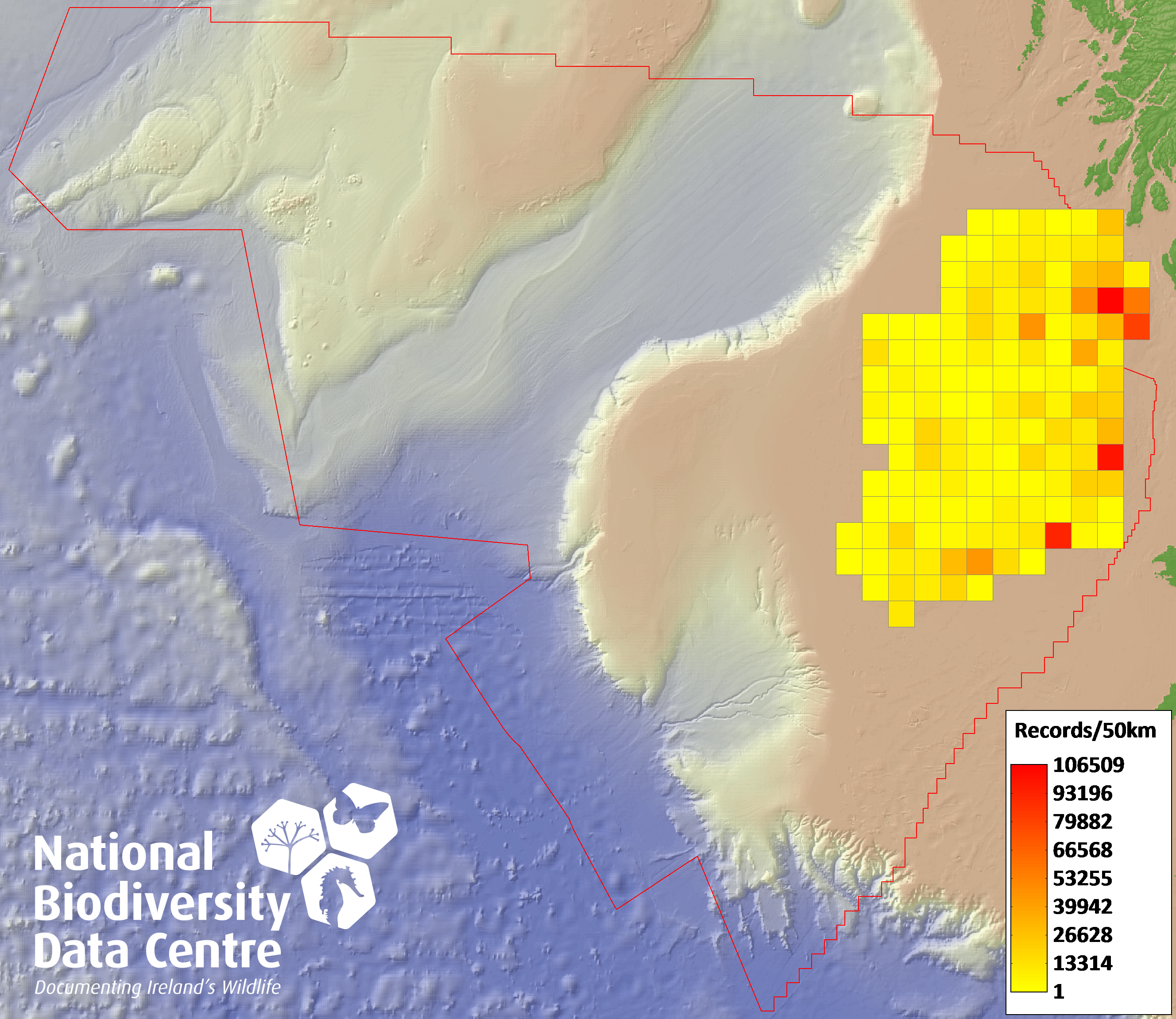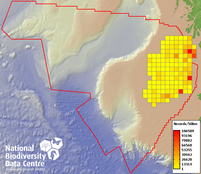 Distribution of the number of records within each 10km grid square (ITM).Marine Map - 50Km