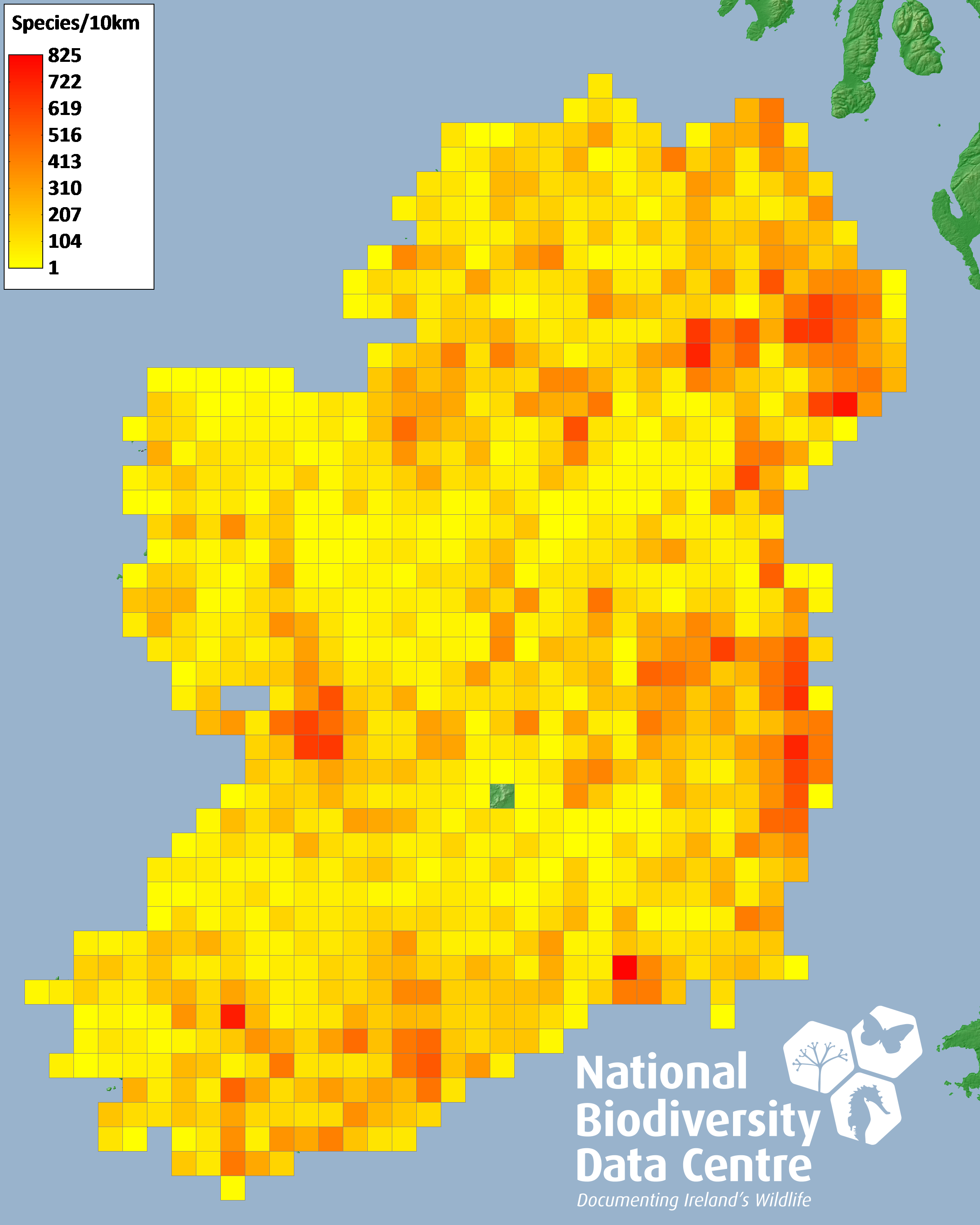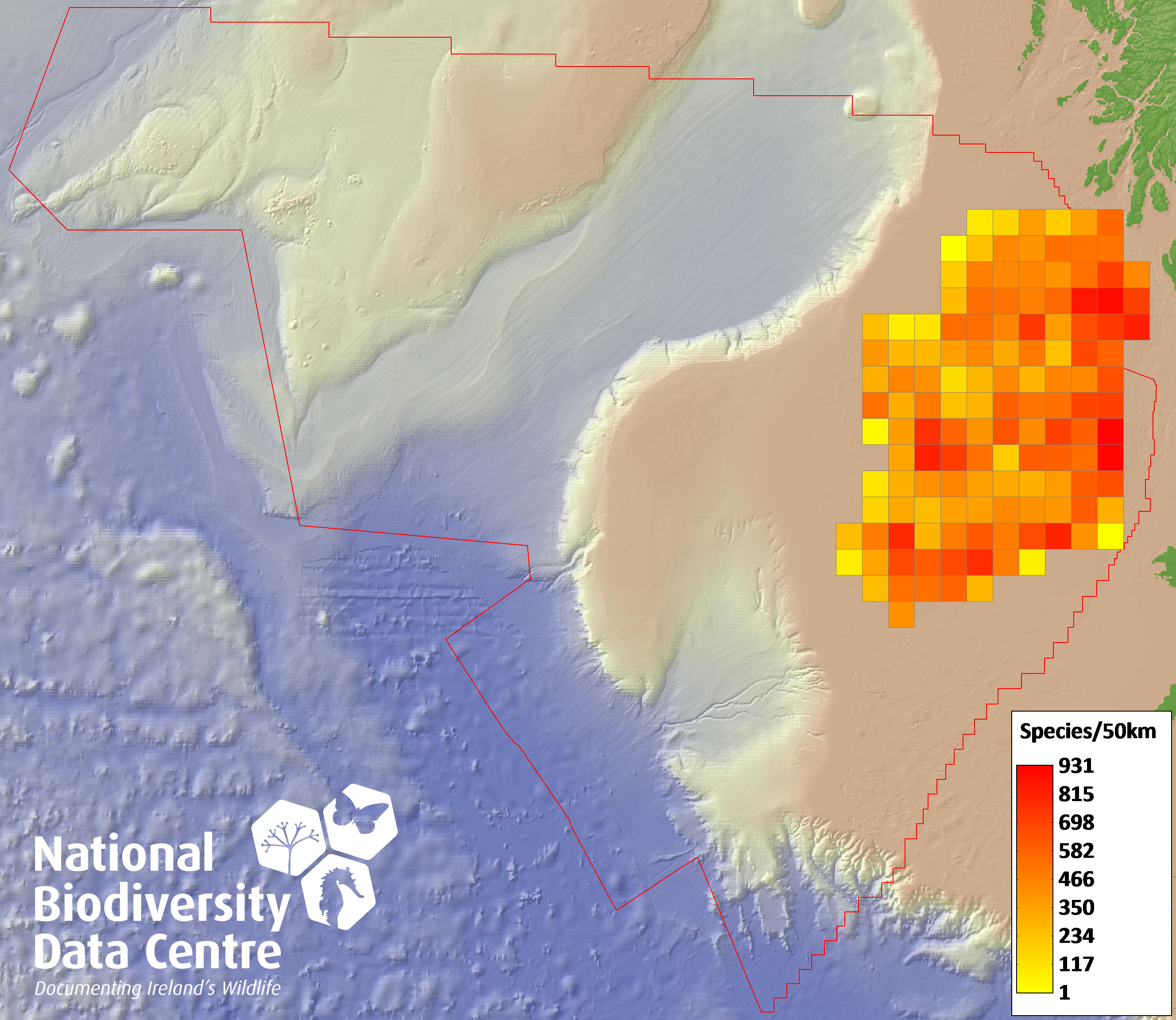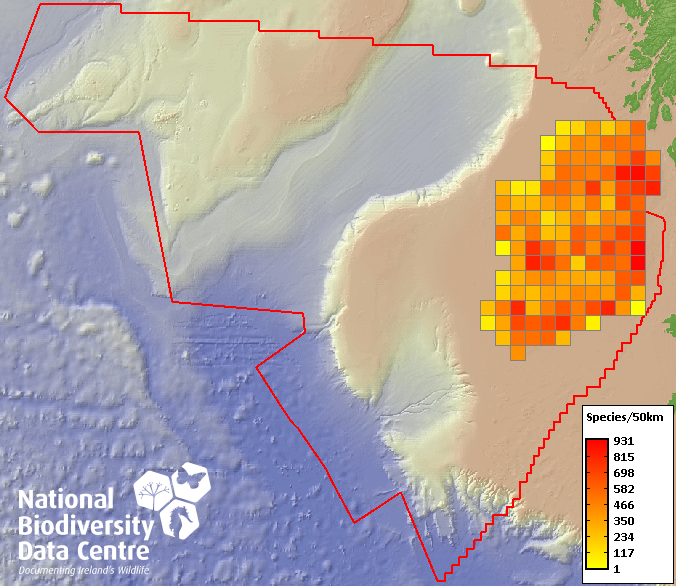 Distribution of the number of species recorded within each 10km grid square (ITM).Marine Map - 50Km