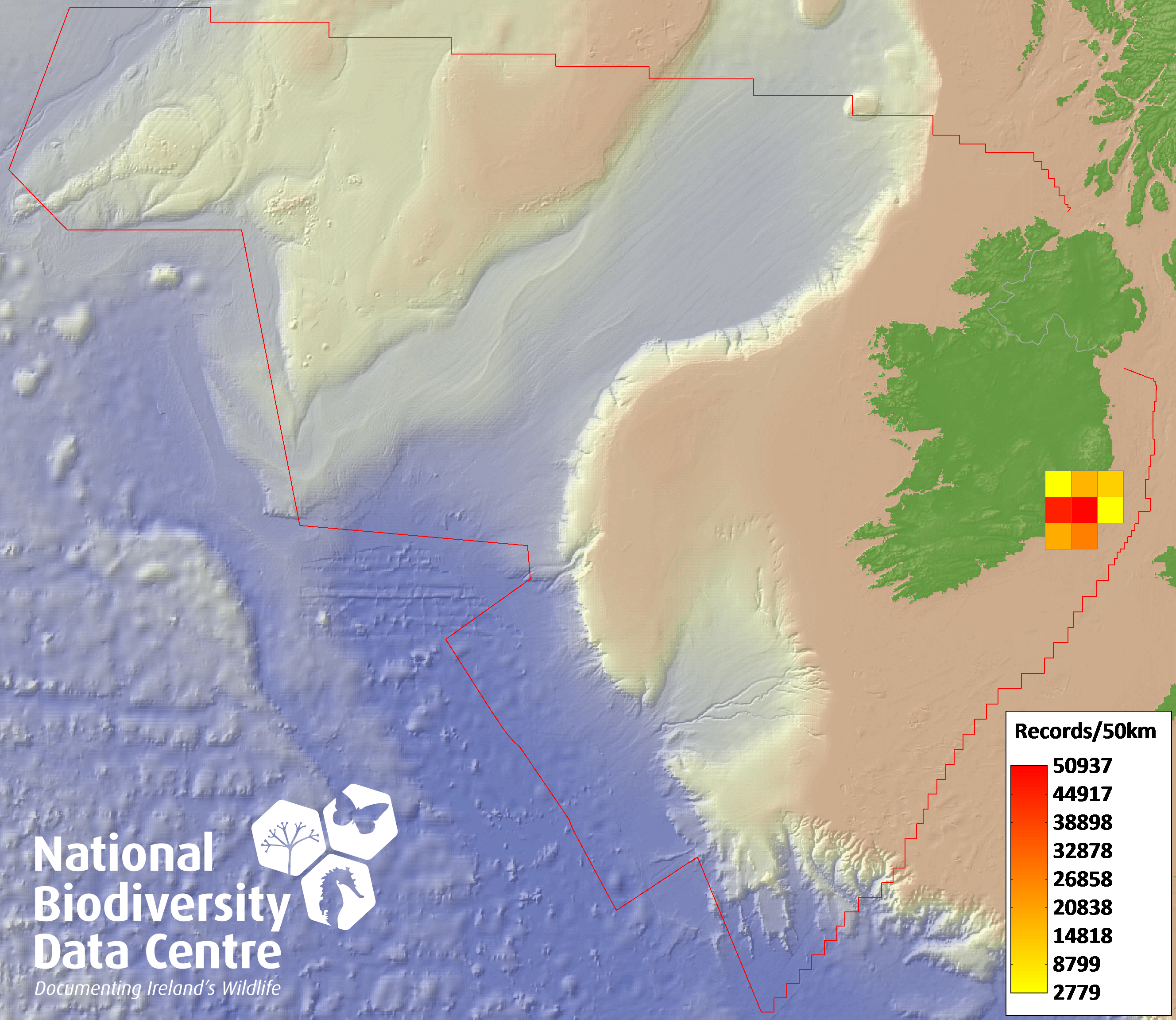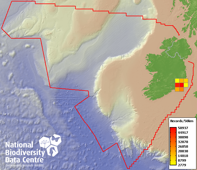 Distribution of the number of records within each 10km grid square (ITM).Marine Map - 50Km