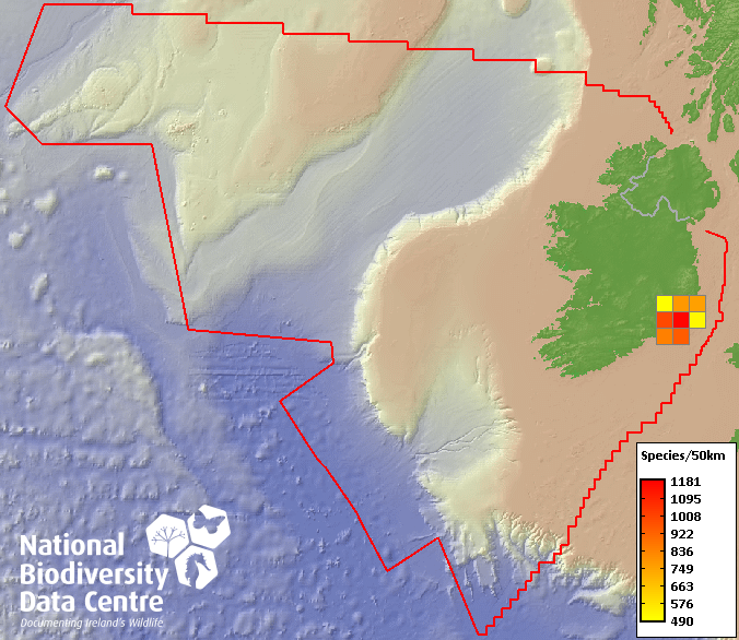 Distribution of the number of species recorded within each 10km grid square (ITM).Marine Map - 50Km
