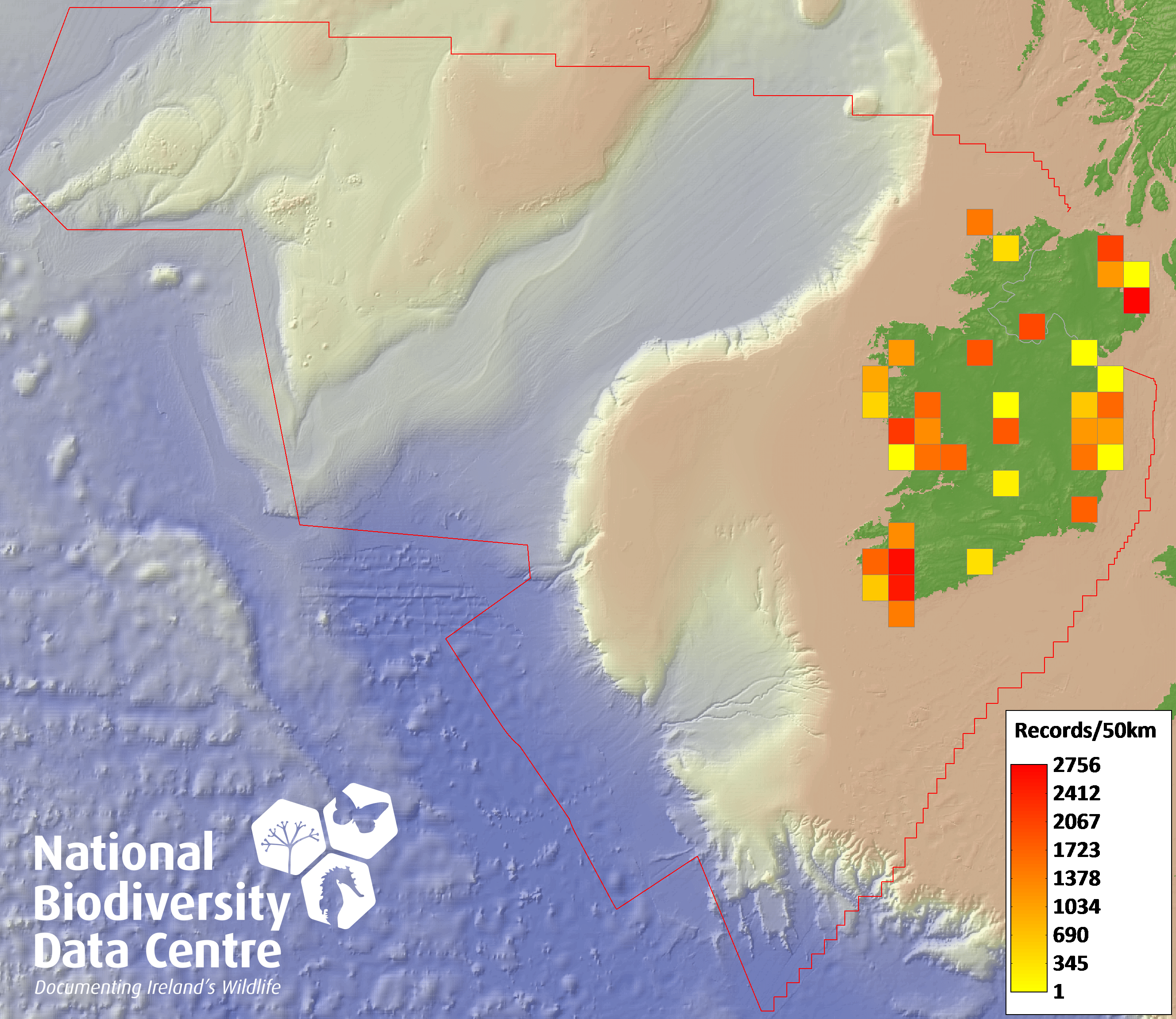 Distribution of the number of records within each 10km grid square (ITM).Marine Map - 50Km