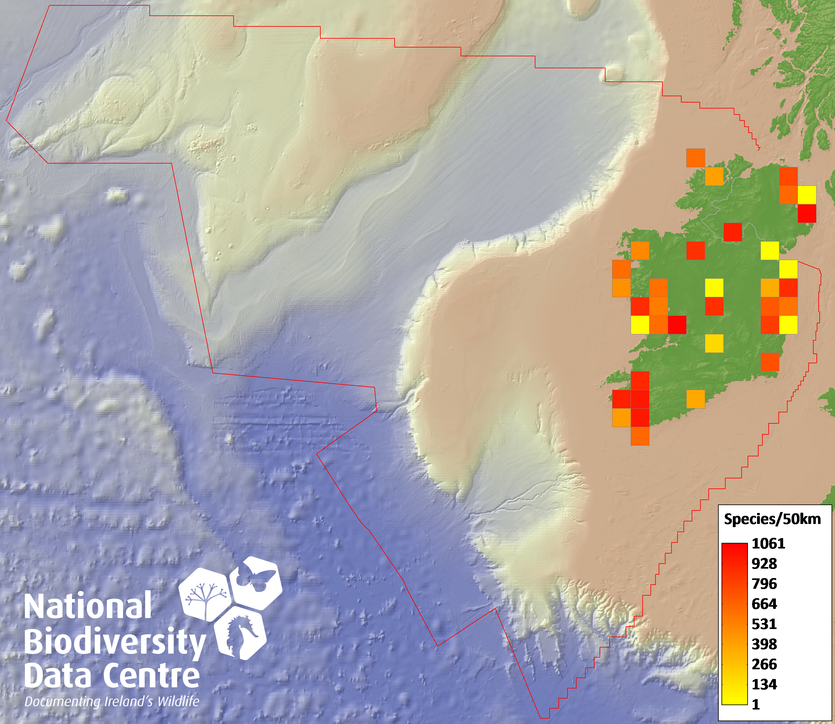 Distribution of the number of species recorded within each 10km grid square (ITM).Marine Map - 50Km