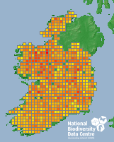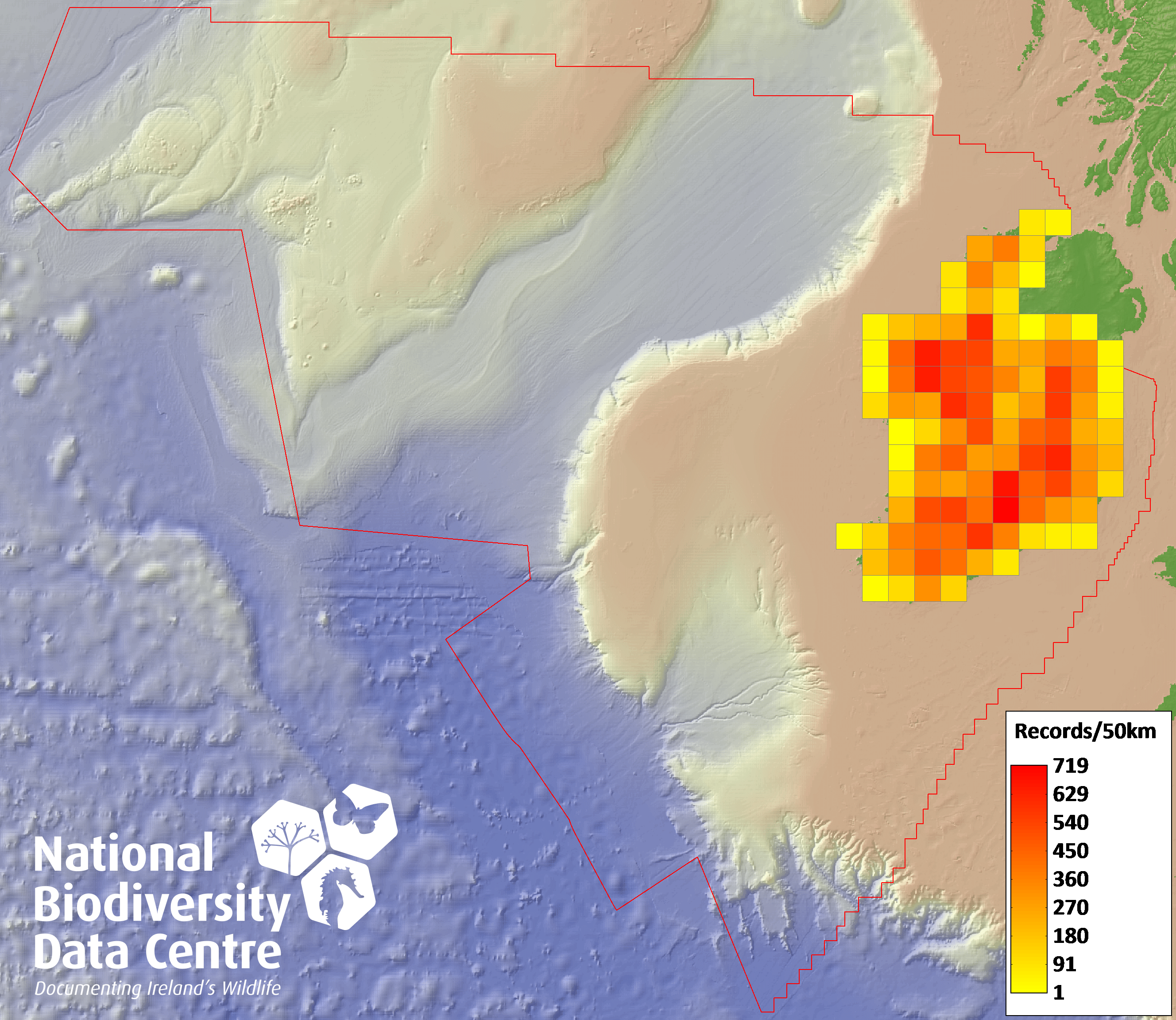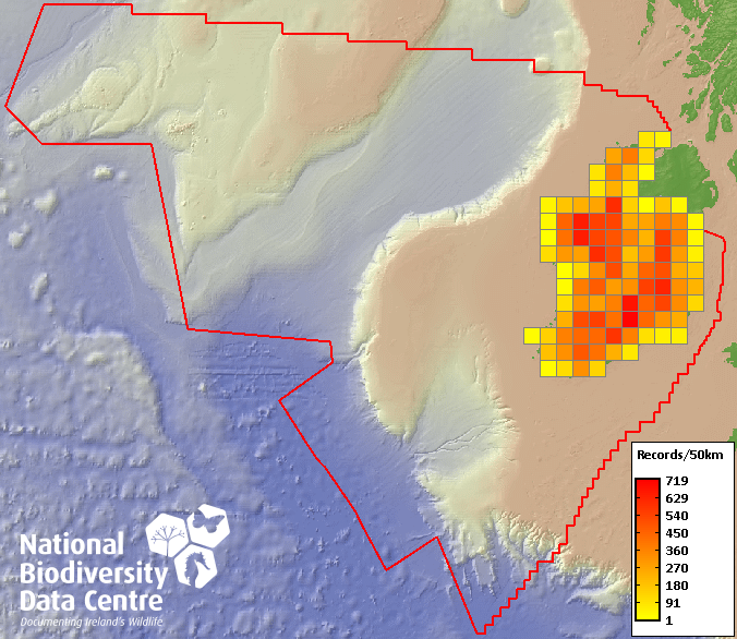 Distribution of the number of records within each 10km grid square (ITM).Marine Map - 50Km