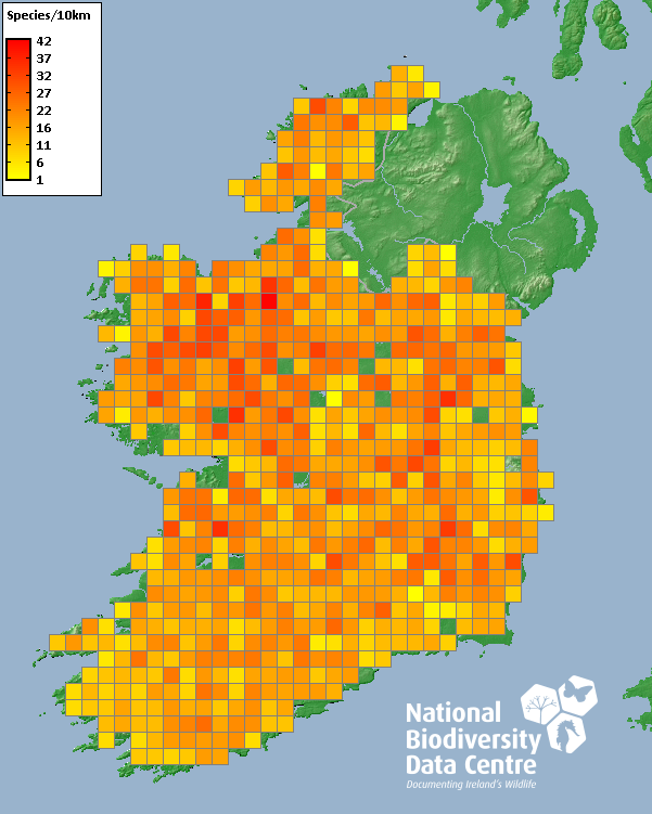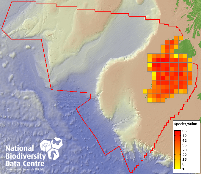 Distribution of the number of species recorded within each 10km grid square (ITM).Marine Map - 50Km