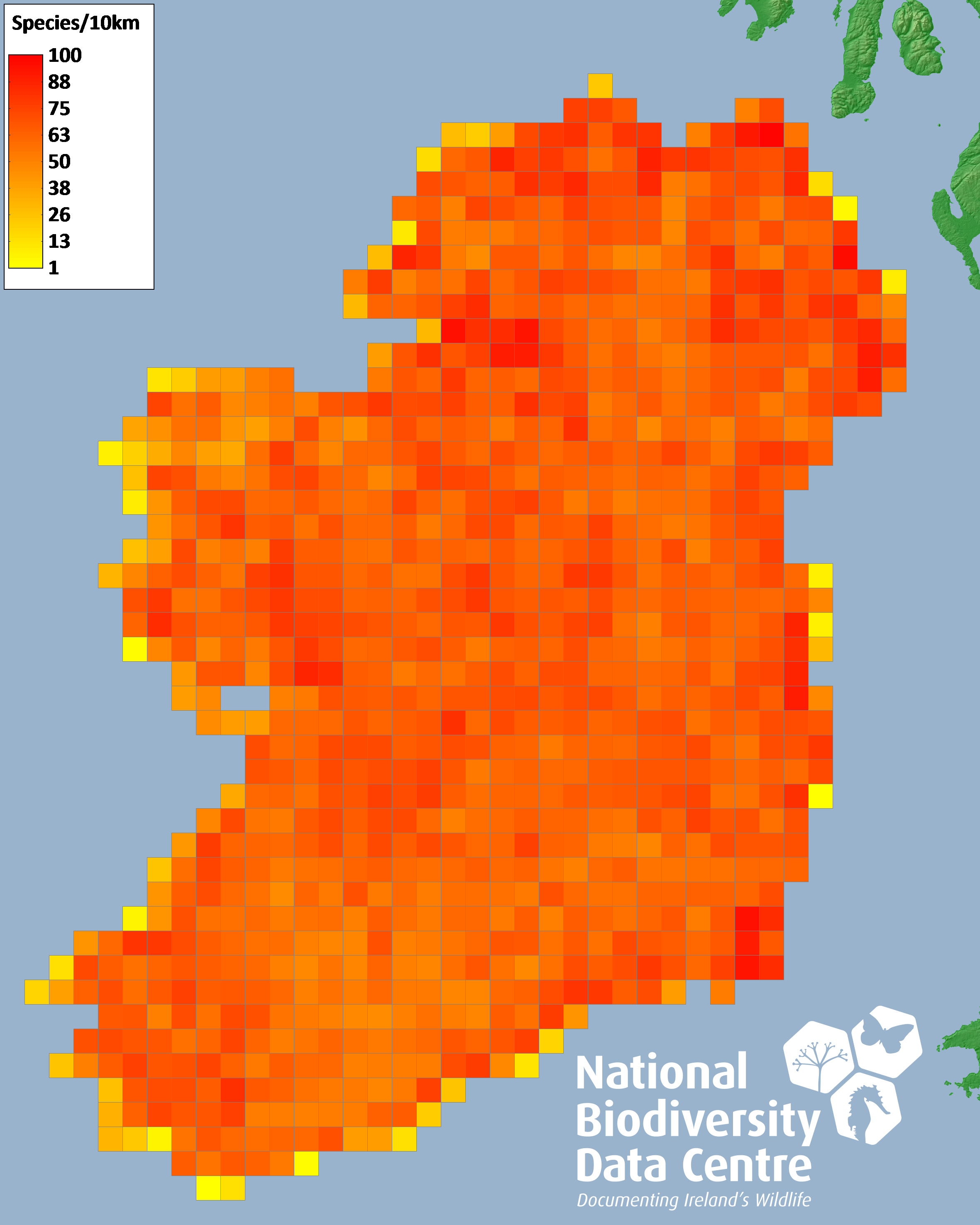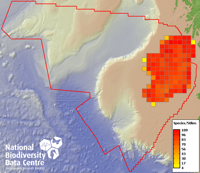 Distribution of the number of species recorded within each 10km grid square (ITM).Marine Map - 50Km