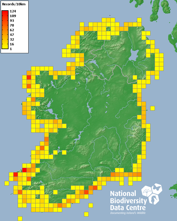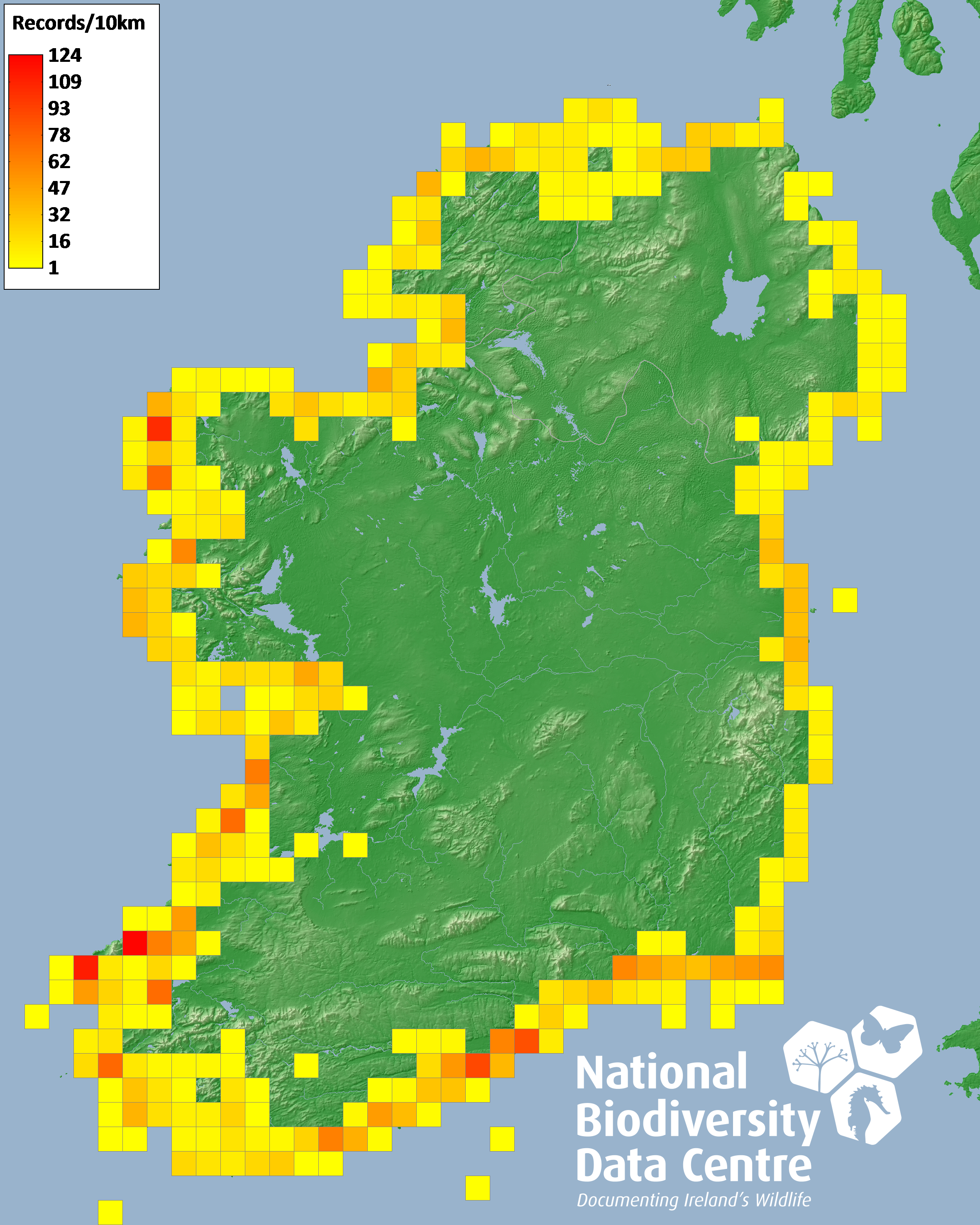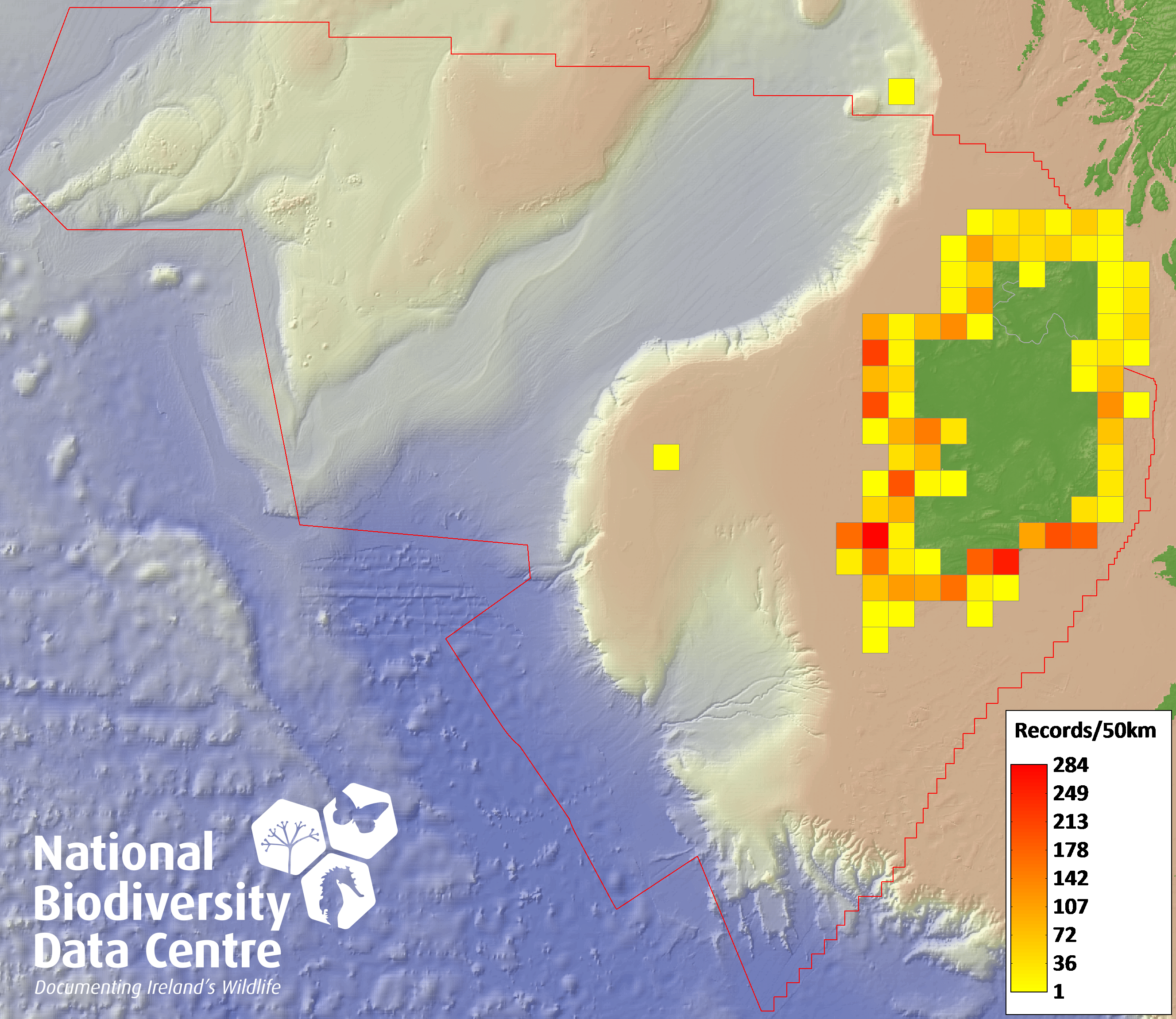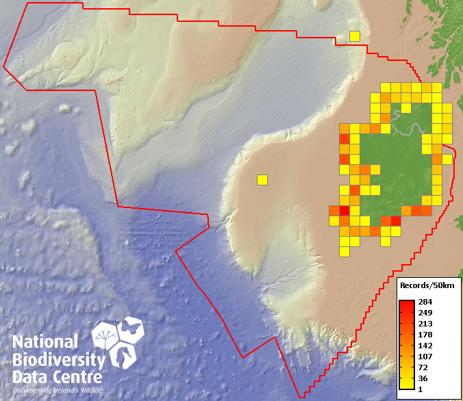 Distribution of the number of records within each 10km grid square (ITM).Marine Map - 50Km