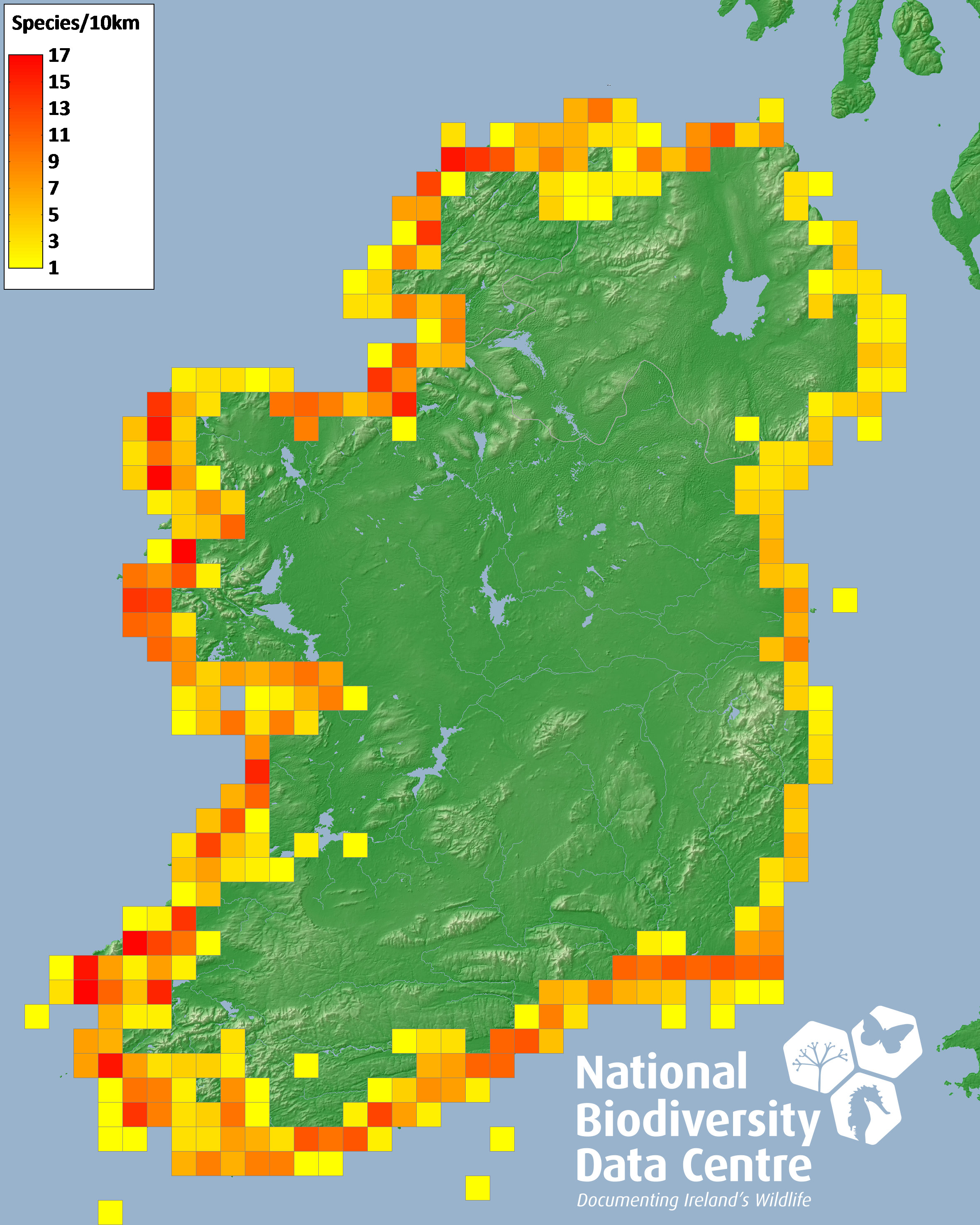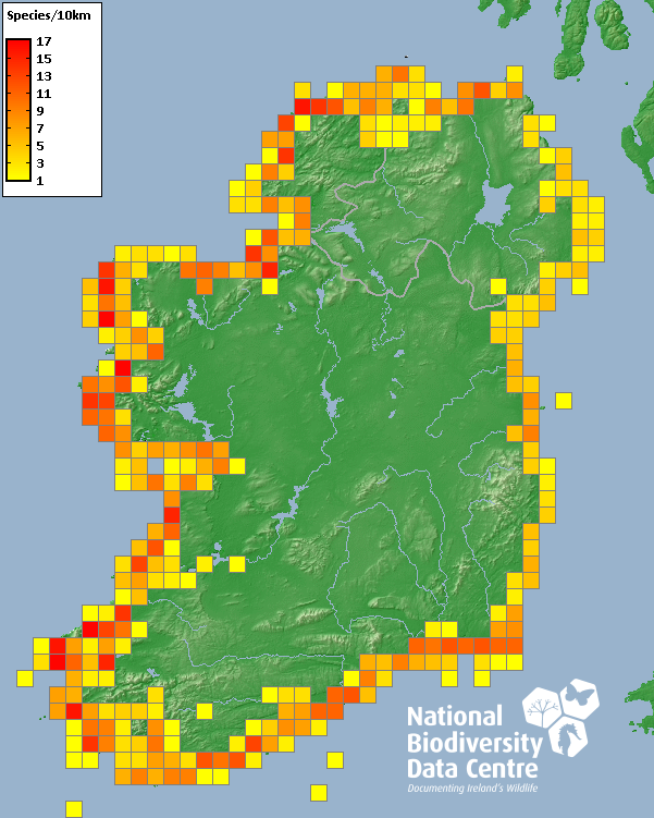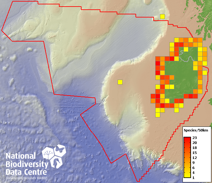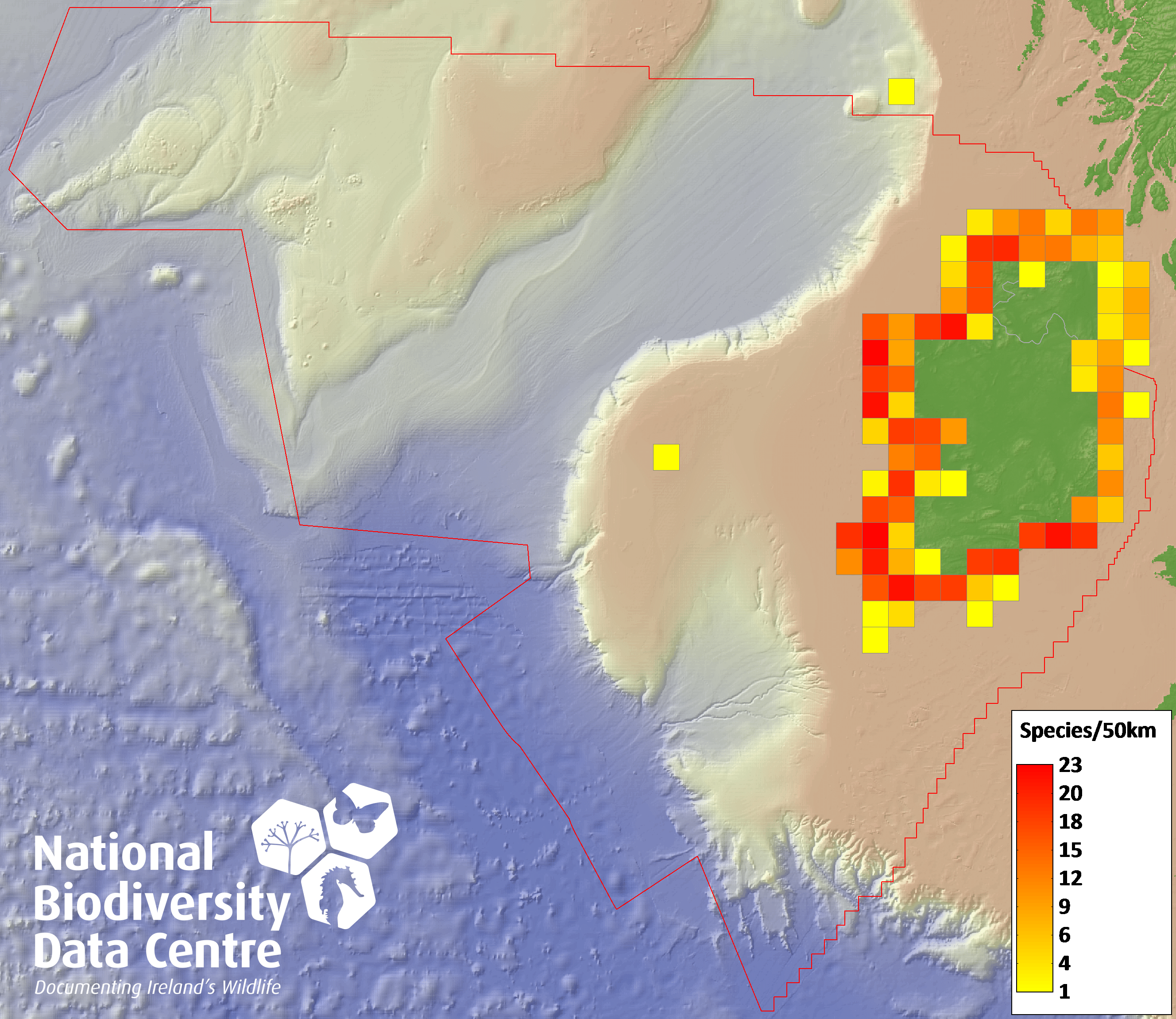 Distribution of the number of species recorded within each 10km grid square (ITM).Marine Map - 50Km