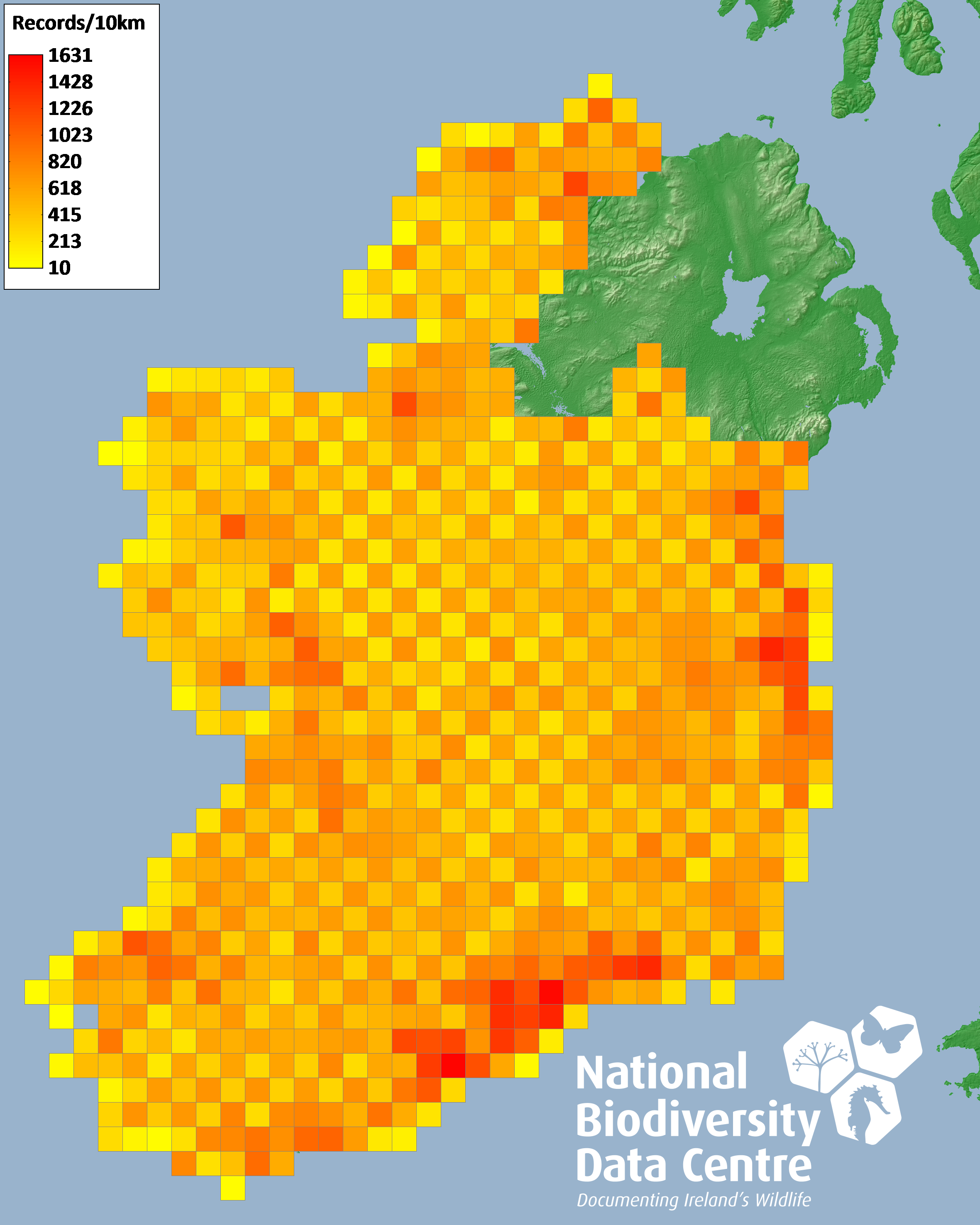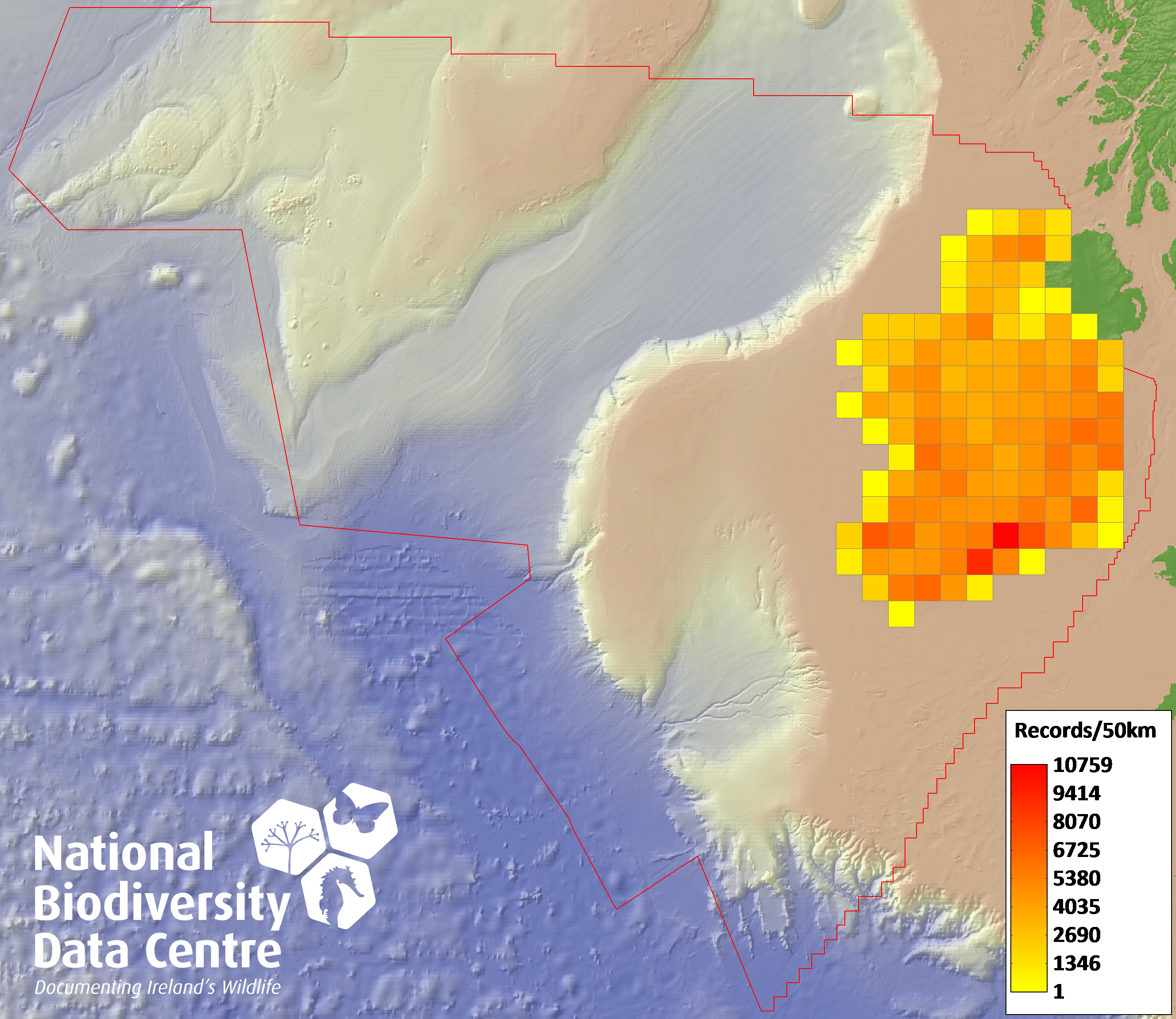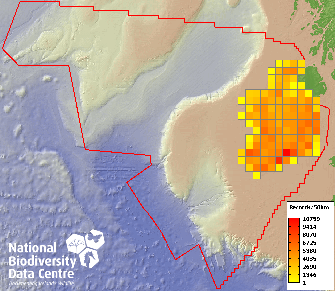 Distribution of the number of records within each 10km grid square (ITM).Marine Map - 50Km