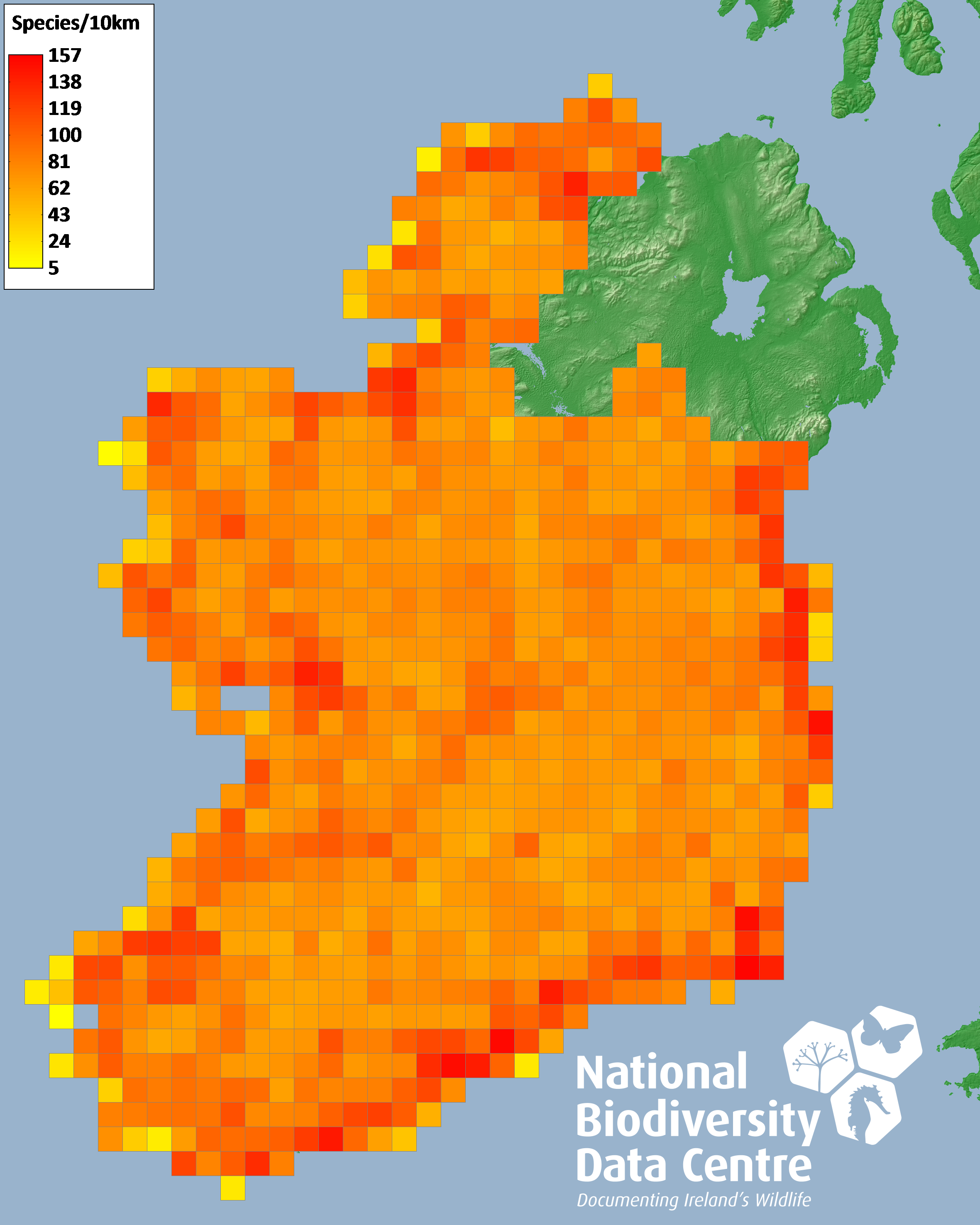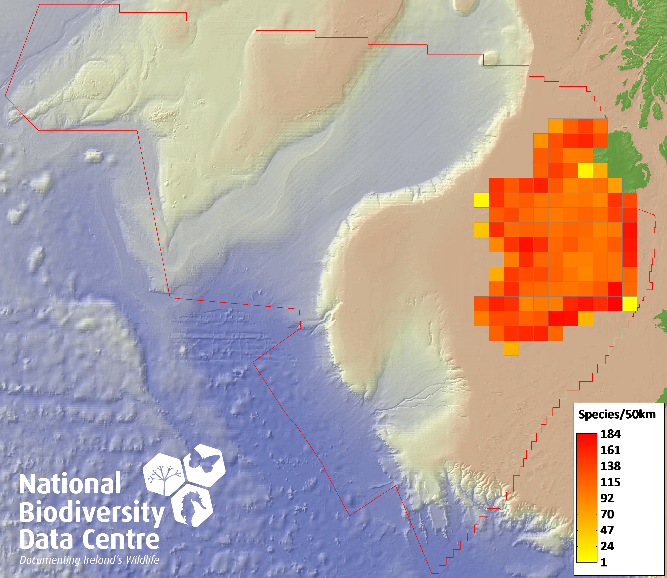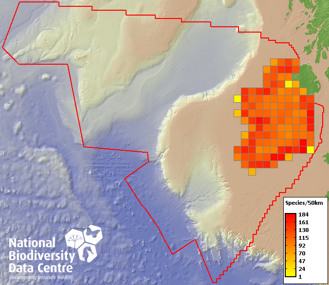 Distribution of the number of species recorded within each 10km grid square (ITM).Marine Map - 50Km