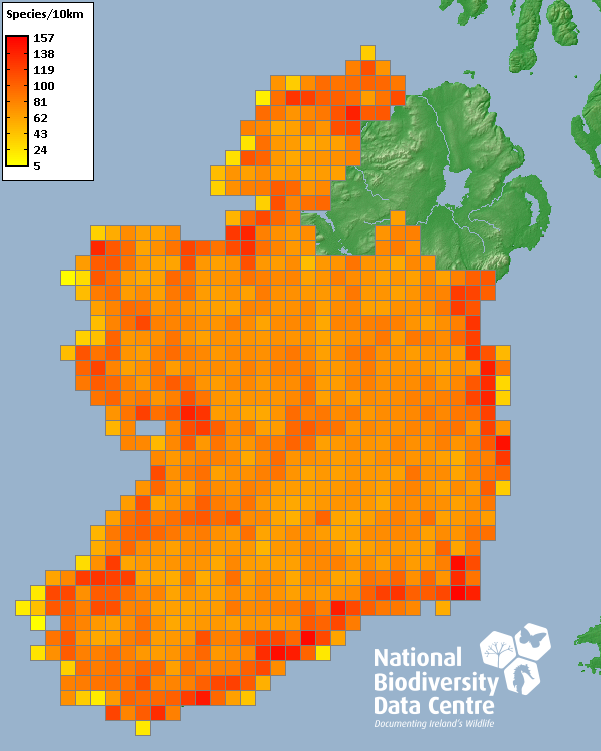Complete, except for records of some of Ireland's rarest birds.Sighting of red-necked phalarope, white-tailed eagle, golden eagle, black-tailed godwit, marsh harrier and little ringed plover during the breeding season, and golden eagle in winter, are not mapped in order to safeguard these species from possible disturbance.