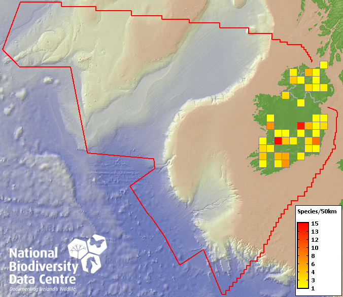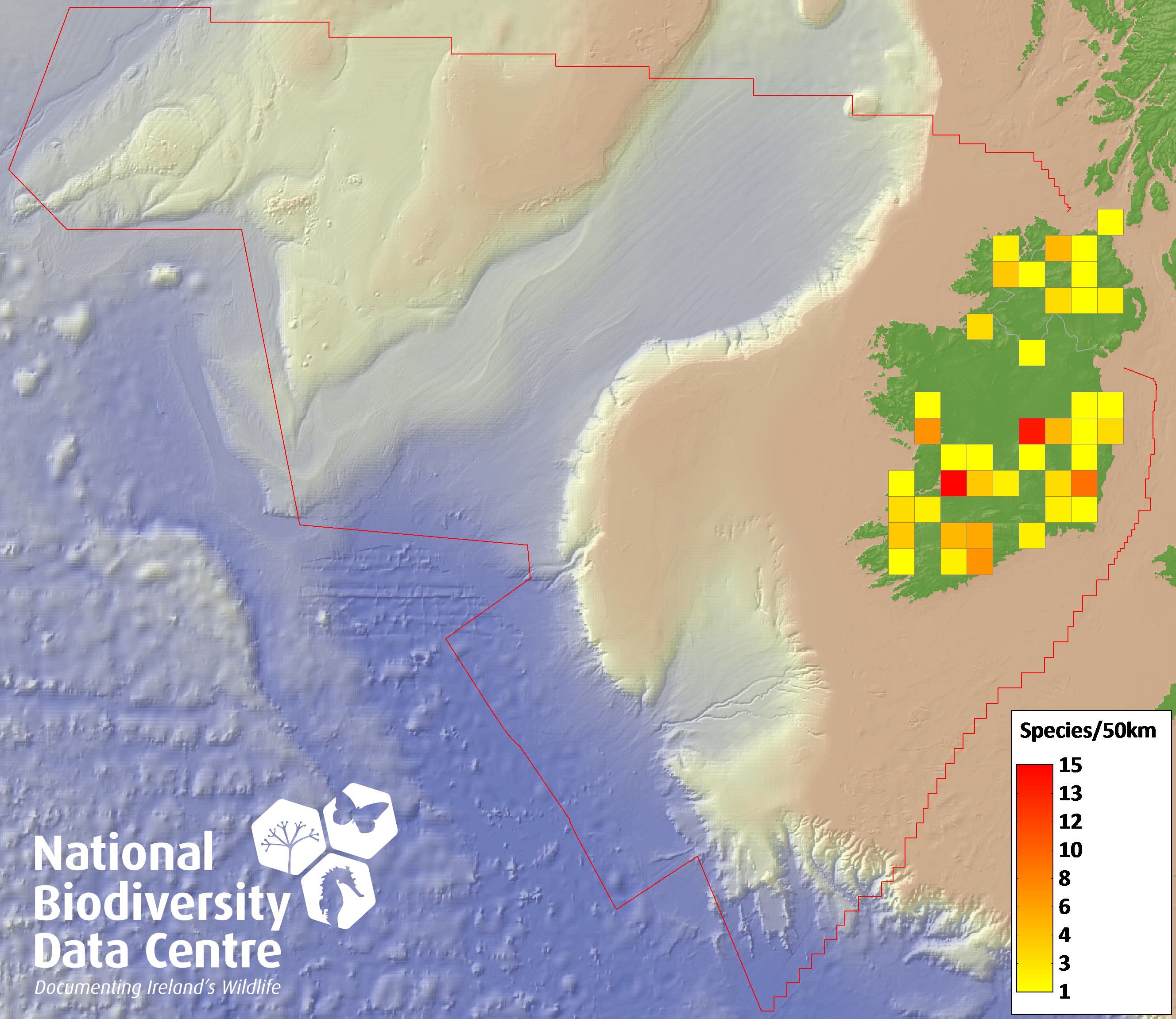 Distribution of the number of species recorded within each 10km grid square (ITM).Marine Map - 50Km