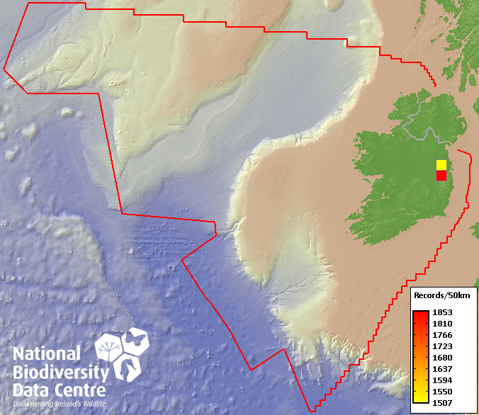 Distribution of the number of records within each 10km grid square (ITM).Marine Map - 50Km