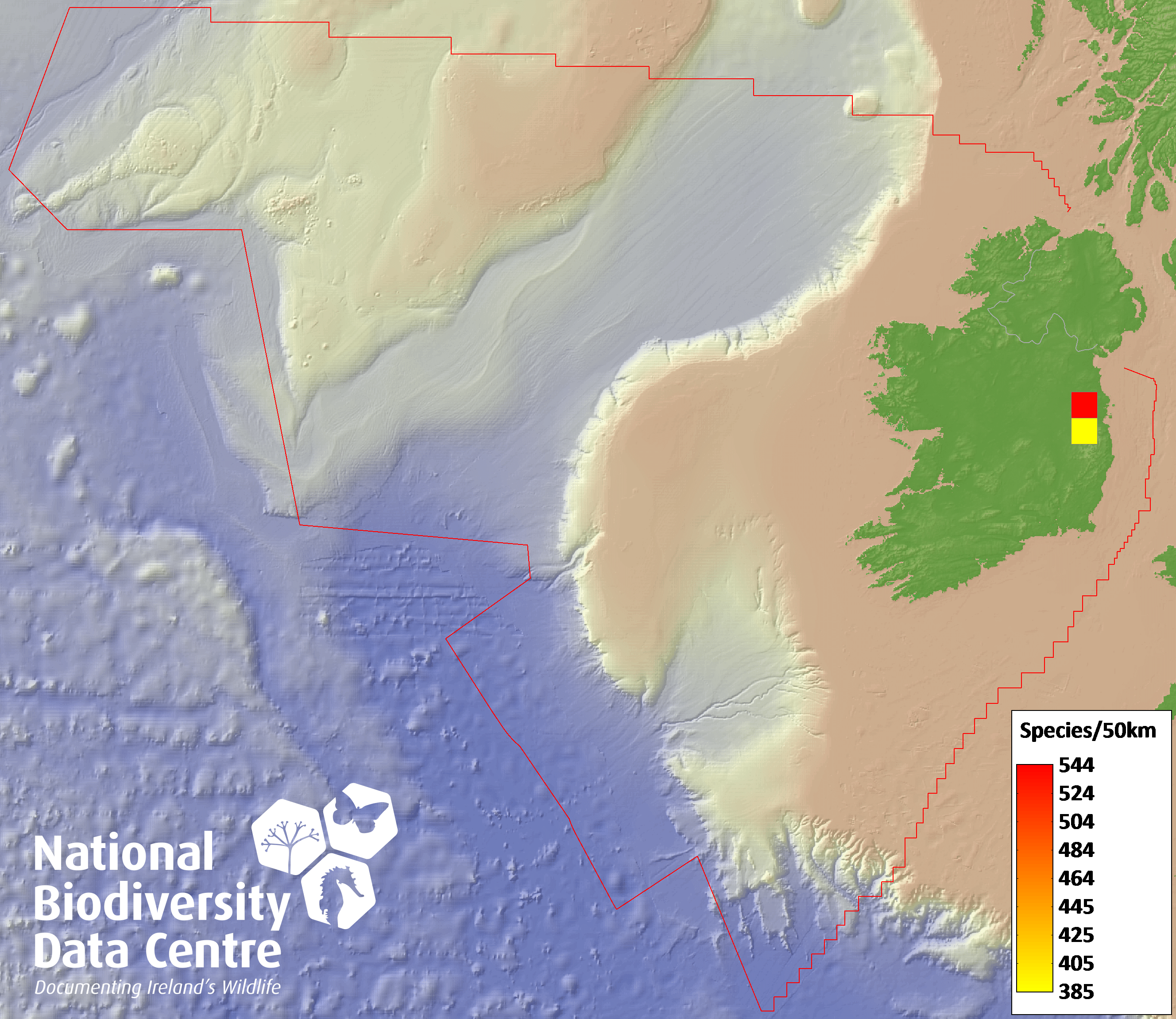 Distribution of the number of species recorded within each 10km grid square (ITM).Marine Map - 50Km