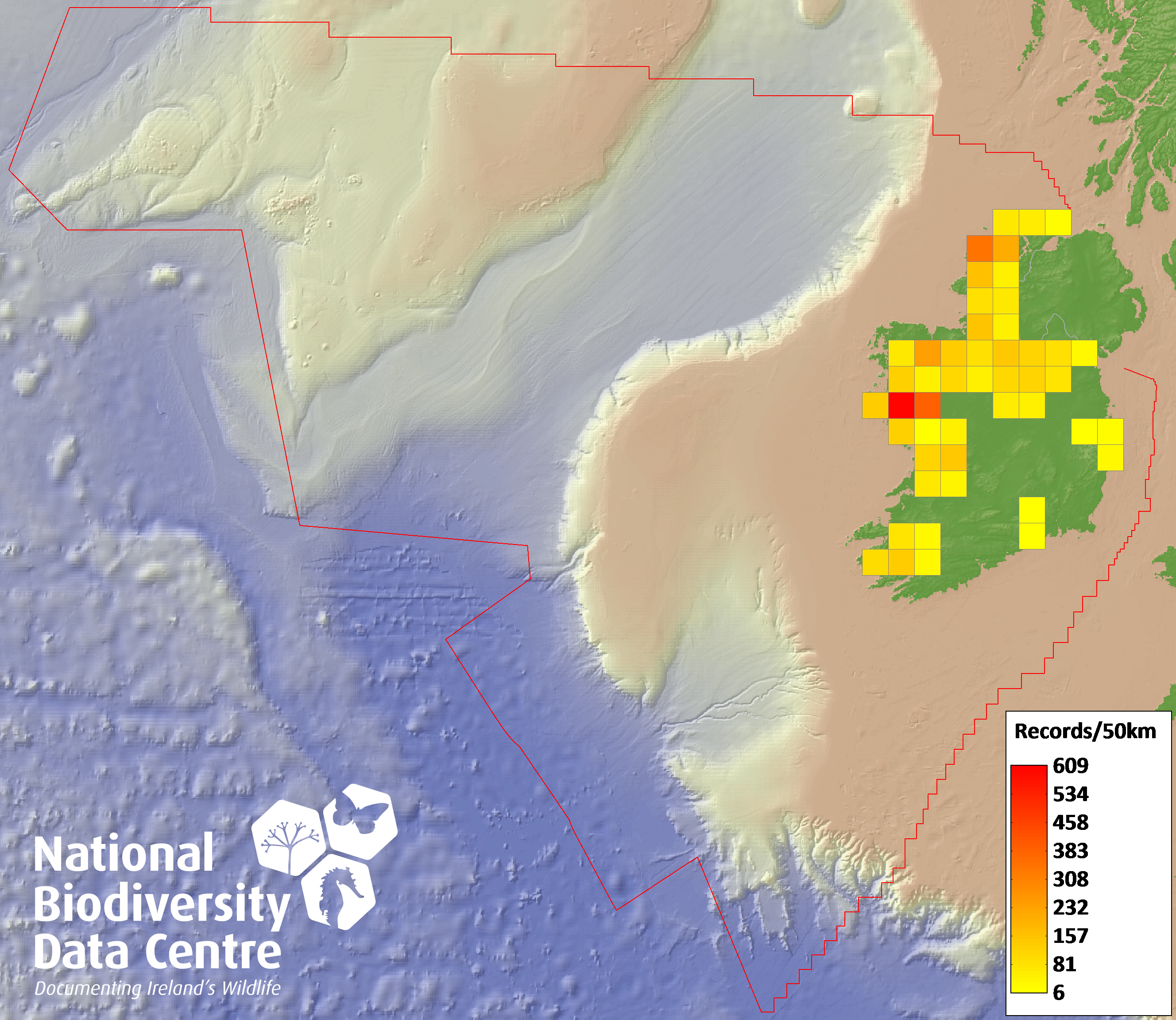 Distribution of the number of records within each 10km grid square (ITM).Marine Map - 50Km