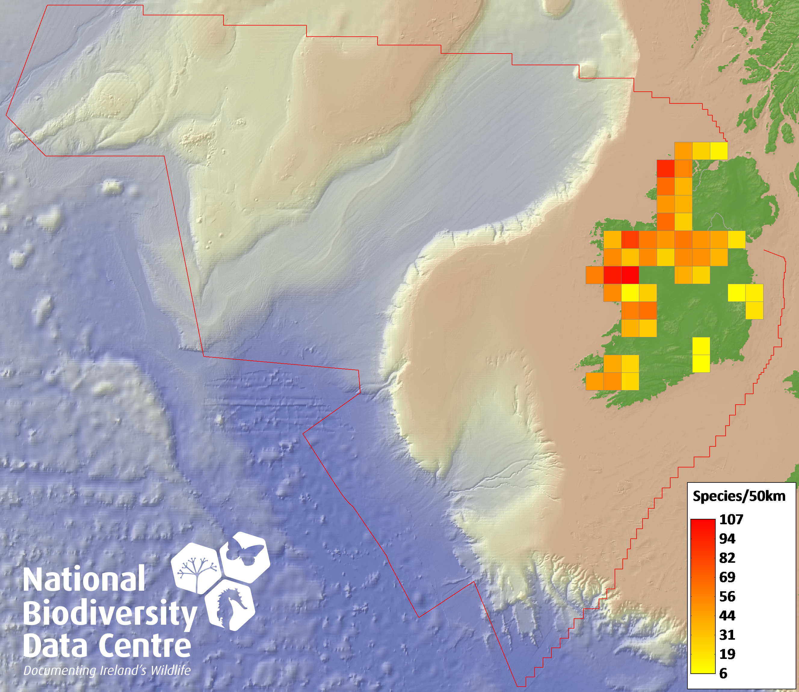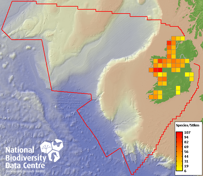 Distribution of the number of species recorded within each 10km grid square (ITM).Marine Map - 50Km