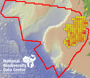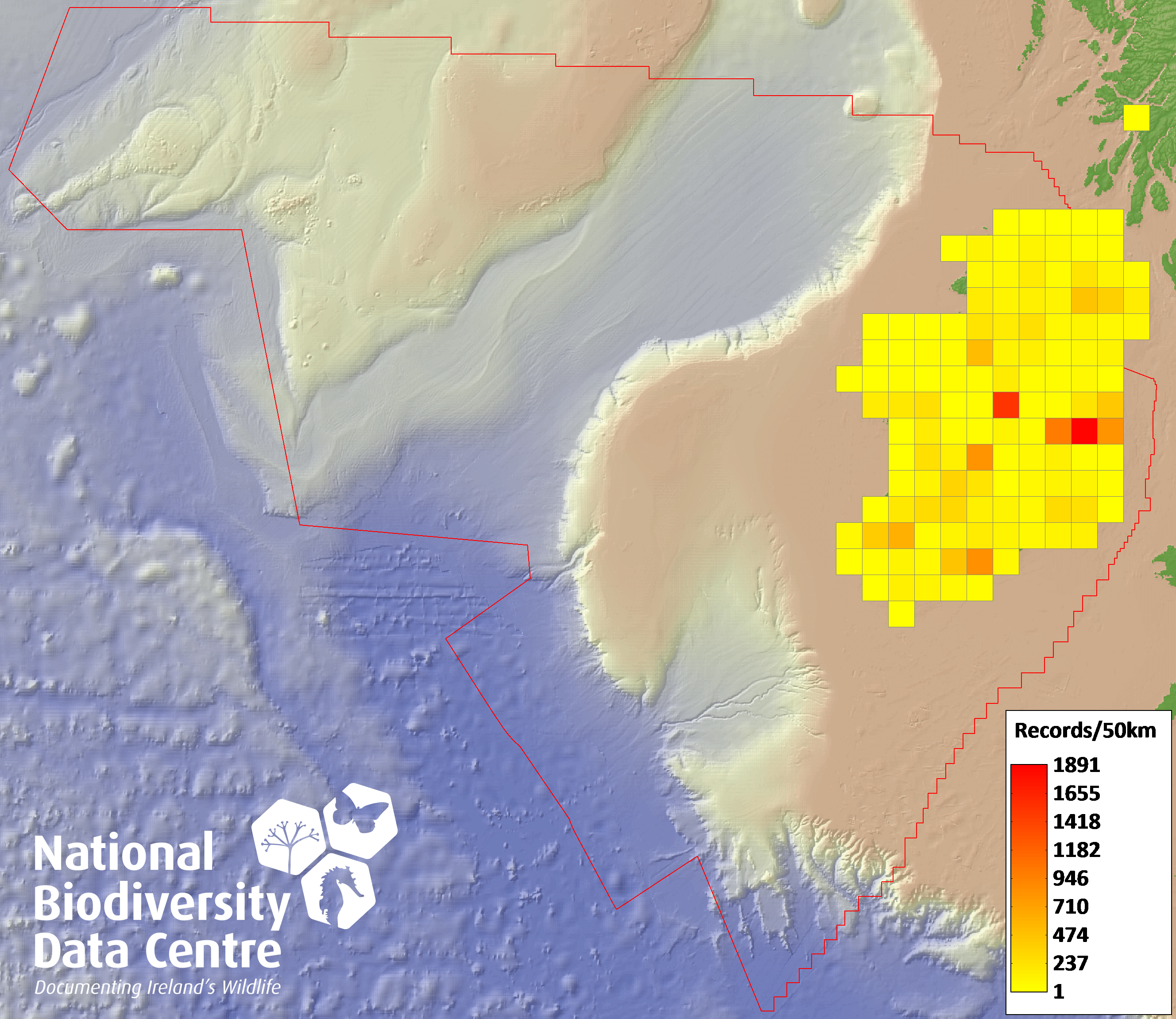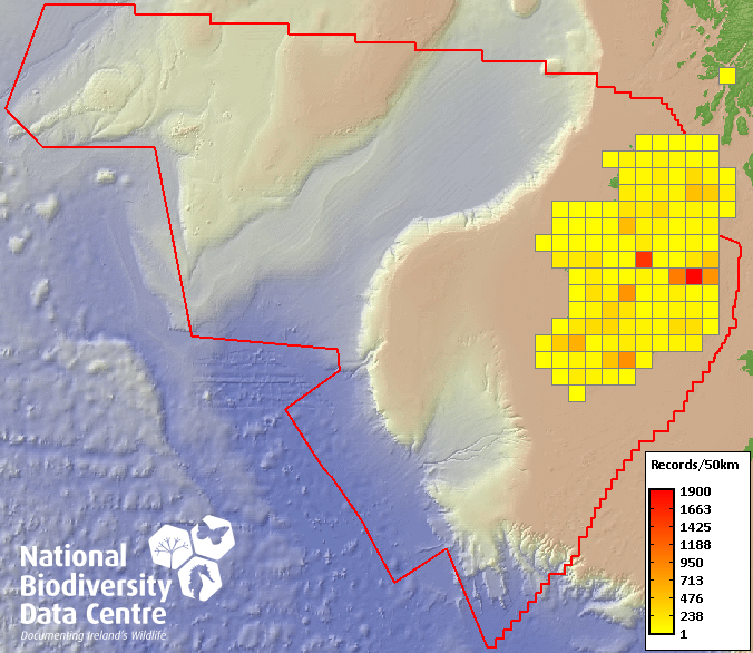 Distribution of the number of records within each 10km grid square (ITM).Marine Map - 50Km