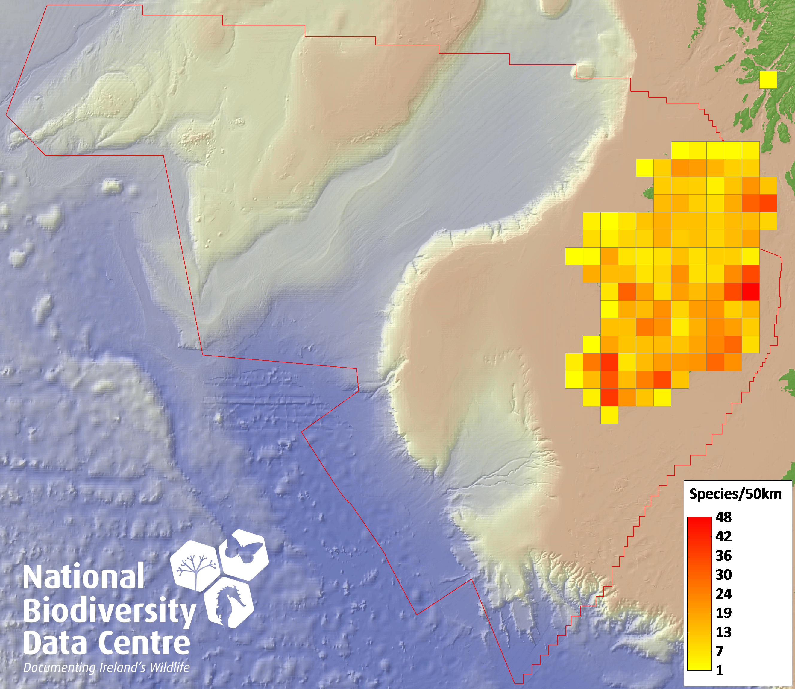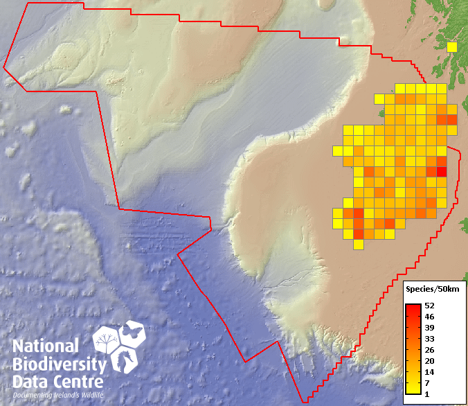 Distribution of the number of species recorded within each 10km grid square (ITM).Marine Map - 50Km