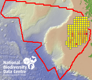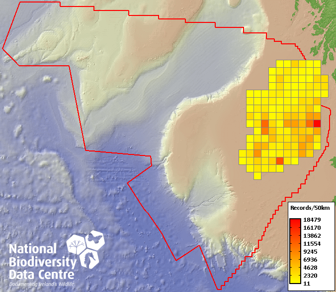 Distribution of the number of records within each 10km grid square (ITM).Marine Map - 50Km