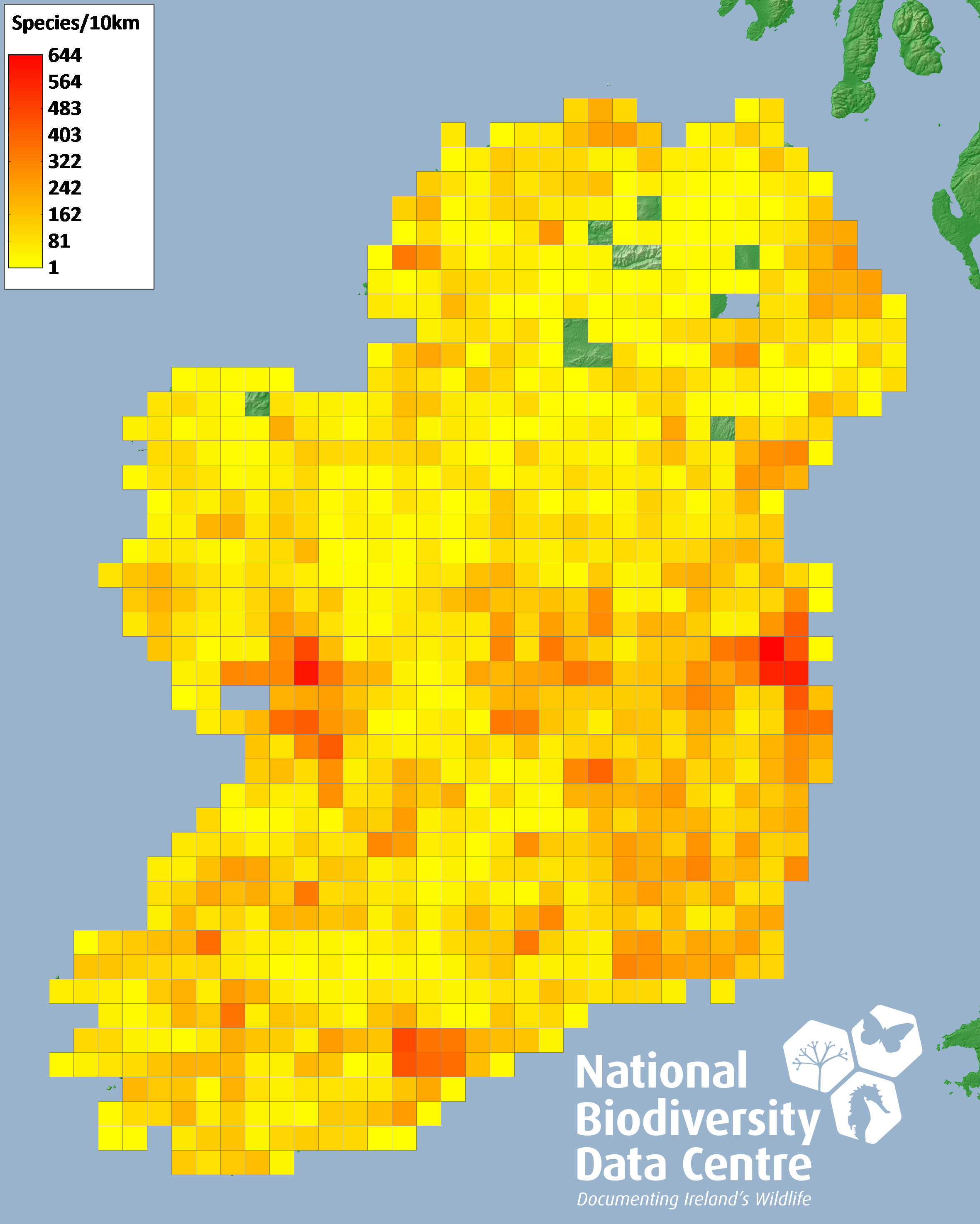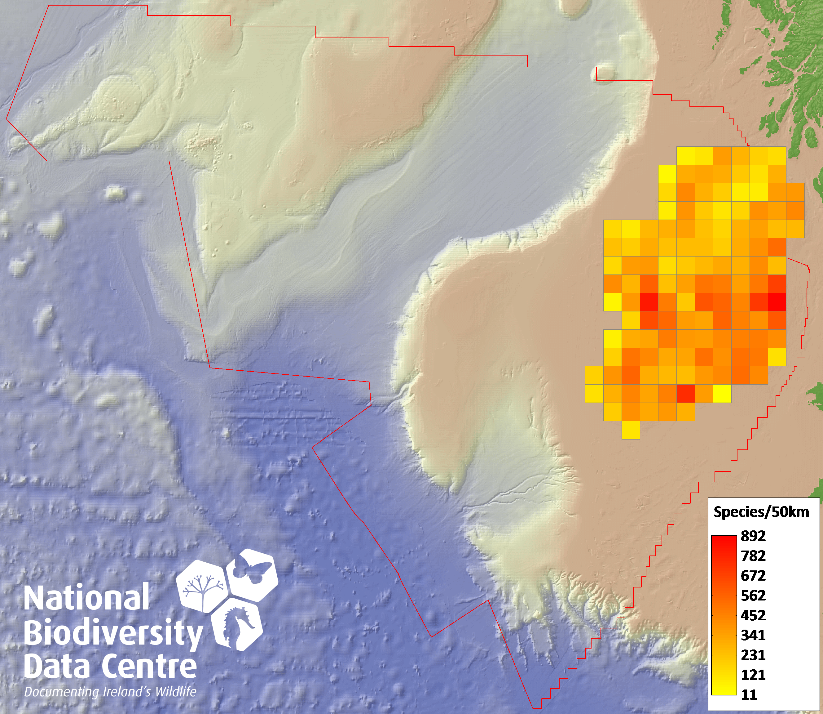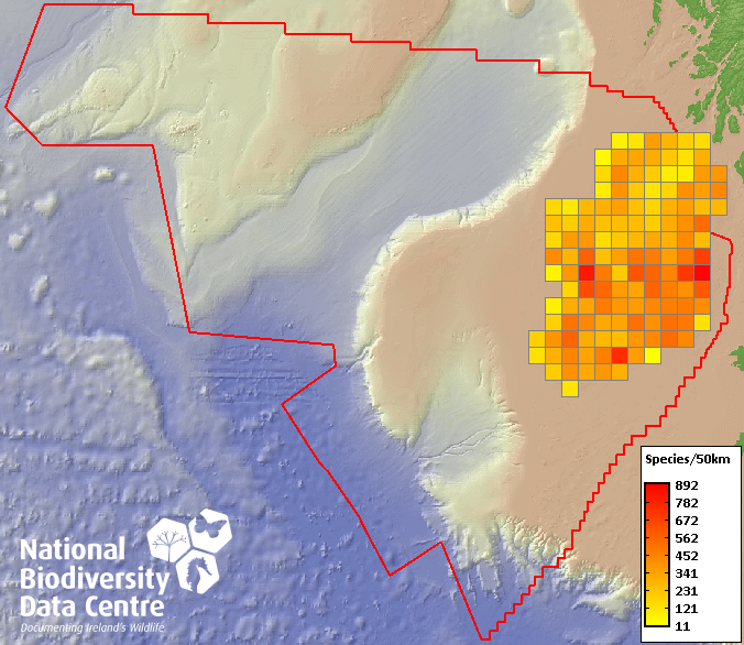 Distribution of the number of species recorded within each 10km grid square (ITM).Marine Map - 50Km