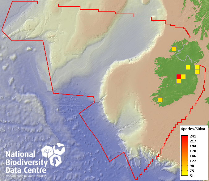 Distribution of the number of species recorded within each 10km grid square (ITM).Marine Map - 50Km
